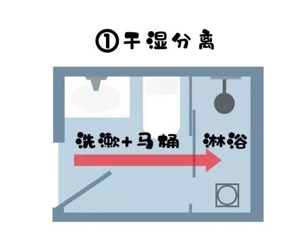 二分离是最常用的干湿分离类型。它对空间的要求相对较低,基本上可以满足小家庭的需求。有两种分离方式,一种是洗 厕所为干区,淋浴为湿区;另一种是拿出洗脸台,厕所 淋浴形成湿区。