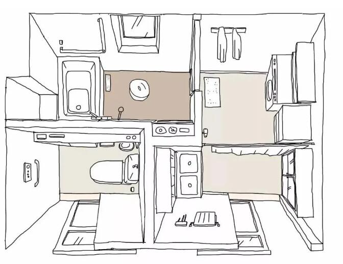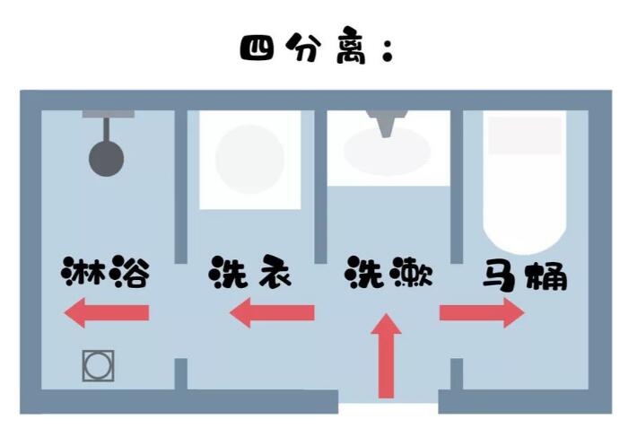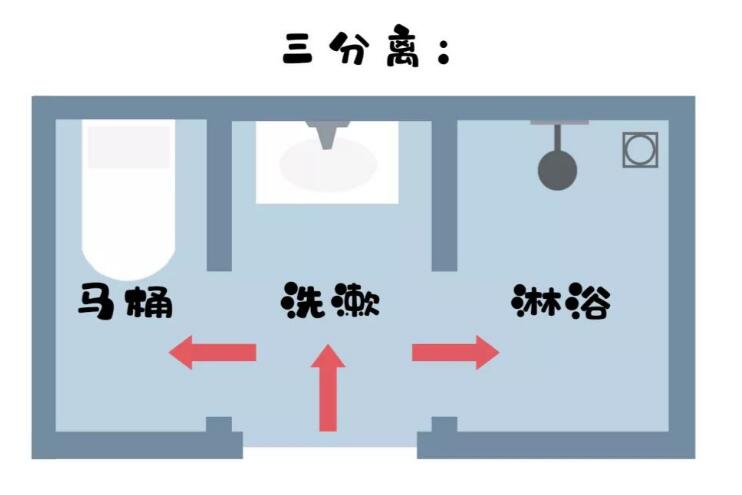 三分离是将洗脸台、卫生间、淋浴器全部分开,中间做隔断,真正做到各功能区域不相互干扰。但该设计对卫生间布局和面积有一定的要求,一字布局最合适,面积最好不小于6㎡。