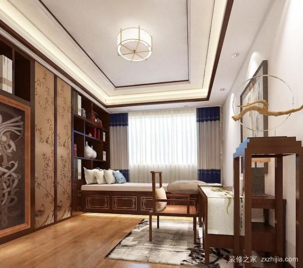 卧室选用的都是木质元素,床头一侧的深咖色木板墙豪华内敛,与木质的床头柜合二为一,显示了户主的典雅个性。此为窗棂、开门和地板用古拙的原木,又将新鲜憨厚的感受呈现出来。这个100平米的装修样板间,将卧室的个性凸显,能体现户主对生活和风的喜爱,一起也体现了户主的高品位。